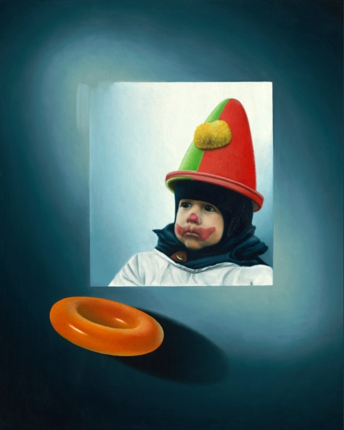 Ole Ahlberg's early paintings were formed by the maxim “a picture in a picture in a picture”, like a set of Chinese boxes. But now there is only one central picture surface, one central scene where the action takes place. Thus Ole Ahlberg has abandoned his subtle illusionism in favor of a more “normal” painting. This hasn’t made his pictures any less enigmatic or ambiguous as he concurrently began making use of a one-color background, black or dark blue, like many of the Dutch Baroque still life artists employed. A background that appears even more inscrutable and mysterious in relation to the brightly illuminated objects in the foreground.